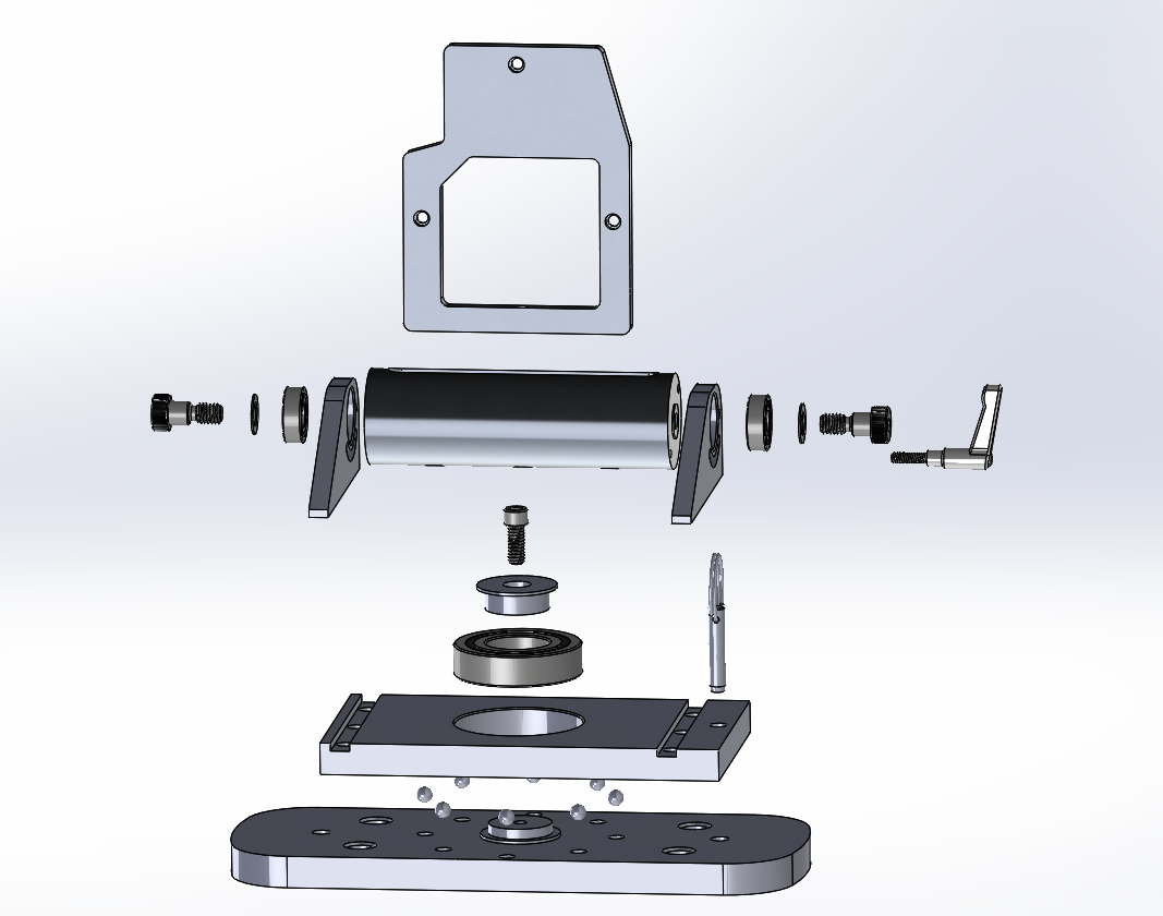 A jig I created to aid with the alignment of our spectrometer. It allows for 360° of rotation and 180° of azimuth rotation. The jig uses a combination of press fit ball bearings and balls to make sure stable rotation in the degrees of freedom that it has. Also included is a locking mechanism to pin the spectrometer in preferred positions. I performed all the design and machining.
